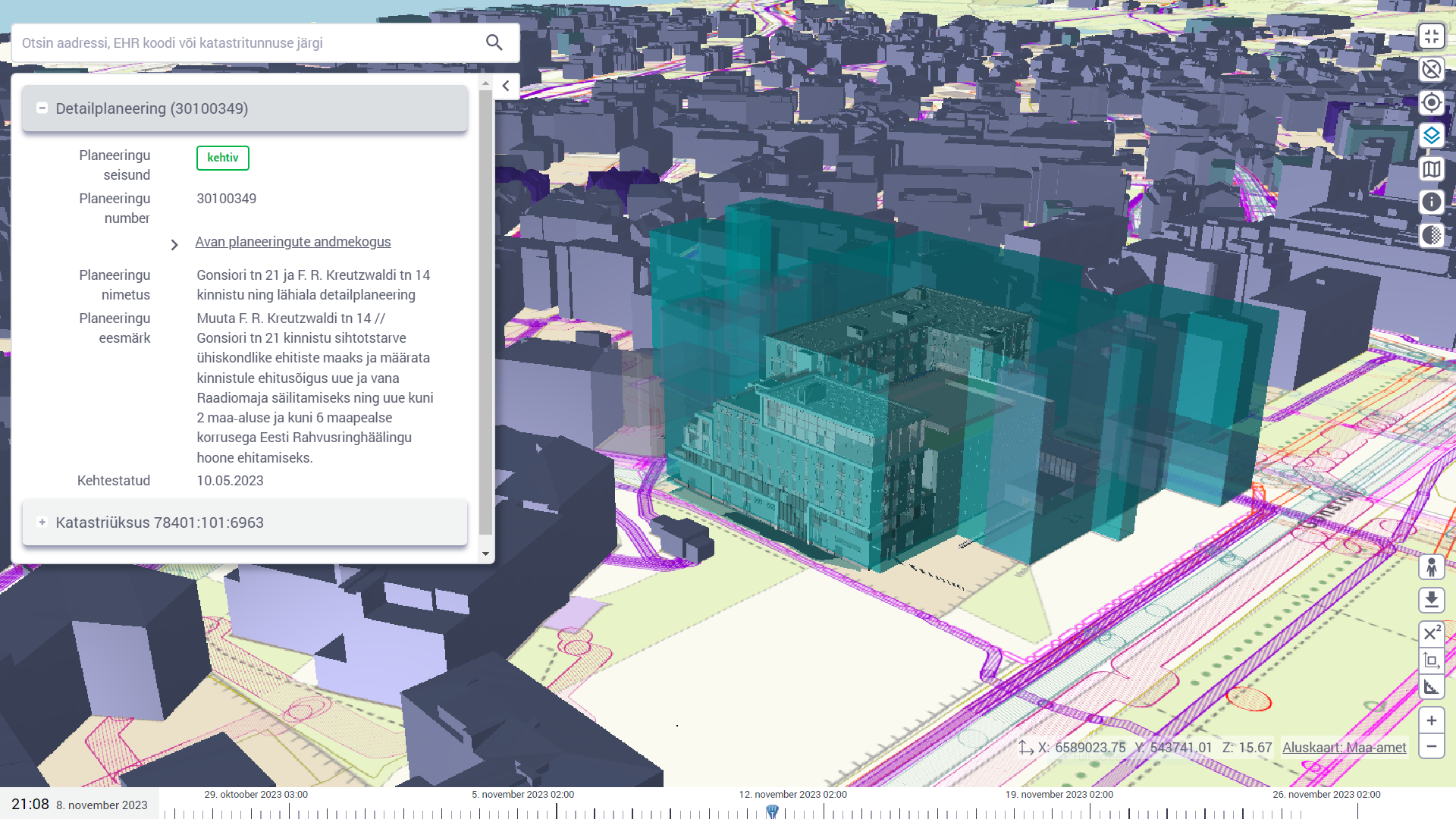 Previously completed 3D pilot project of the City of Tallinn for the detailed planning of the properties at Gonsiori street 21 and F. R. Kreutzwaldi street 14.