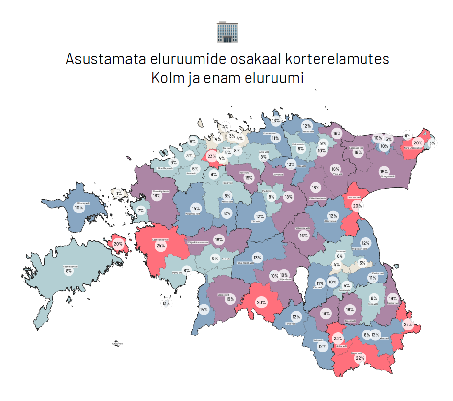 Esialgsed andmed (elektritarbimine) näitasid, et Eestis on 749 439 eluruumist (1.01.2020) üle 50 000 eluruumi asustamata – piltlikult kõik Järva, Jõgeva ja Lääne maakondade eluruumid. Samas selgus, et erinevad andmekihid ei anna kõigi eluruumide tegelikust kasutusest ülevaadet, vaid osutavad kohtadele, mida tuleks kohaliku omavalitsuse tasandil täpsemalt uurida – näiteks hooajaline kasutus.